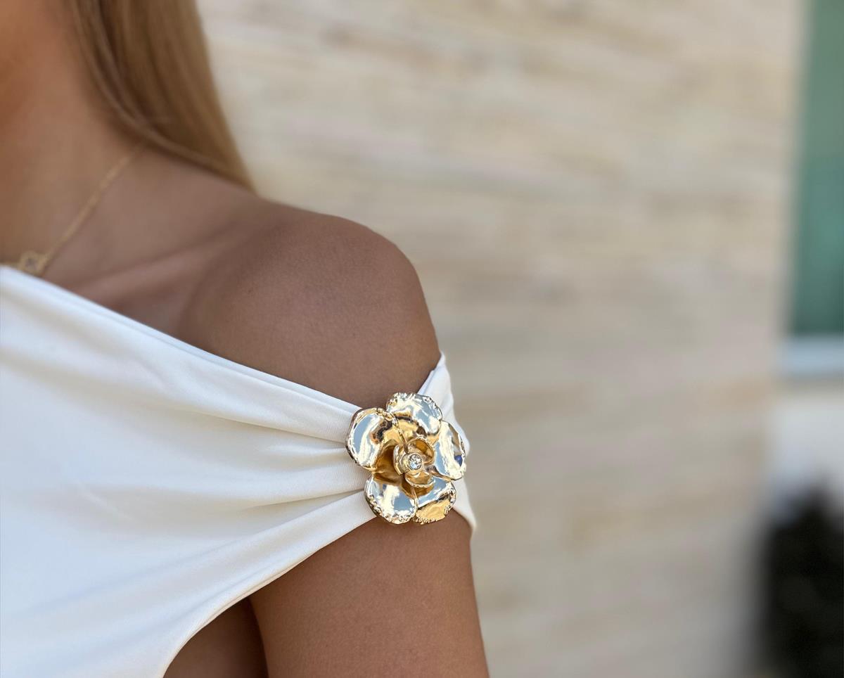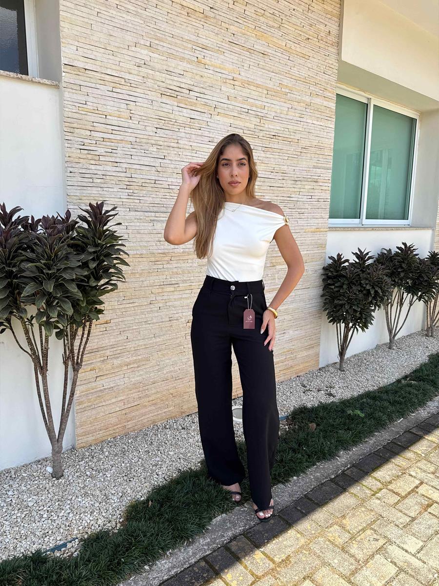 Possui modelagem de um ombro só com detalhe metálico dourado em flor, que adiciona elegância ao visual. Tecido confortável que se ajusta perfeitamente ao corpo. Ideal para looks do dia a noite.