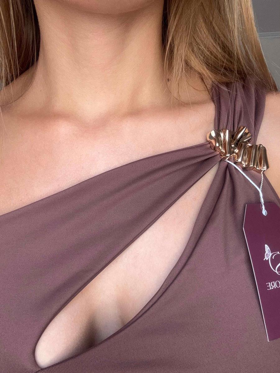 Um ombro só, recorte no busto e detalhe metálico dourado. Elegante, moderno e com tecido confortável que se ajusta perfeitamente ao corpo. Ideal para looks do dia à noite.